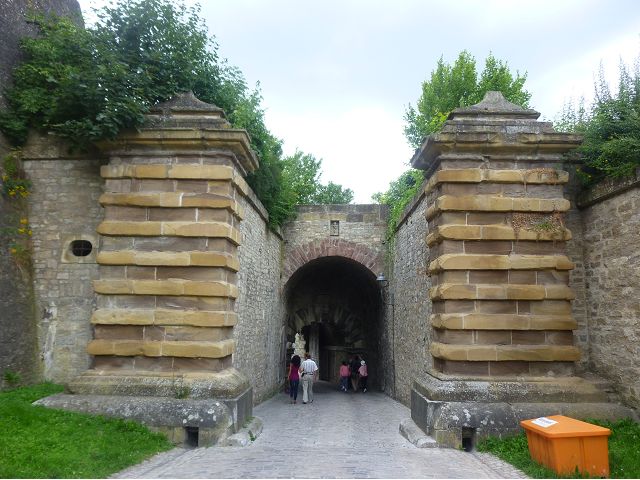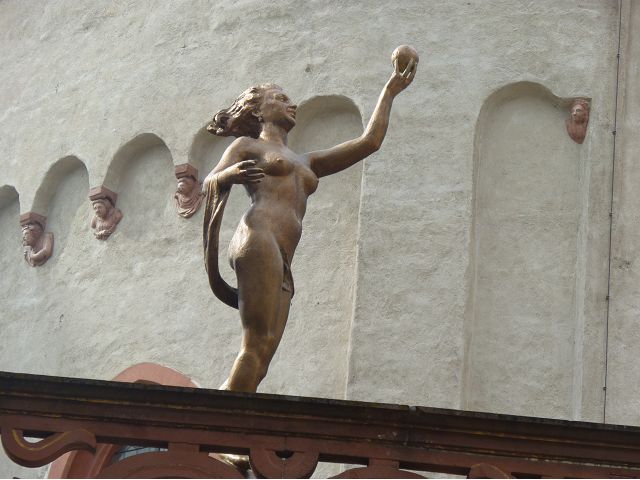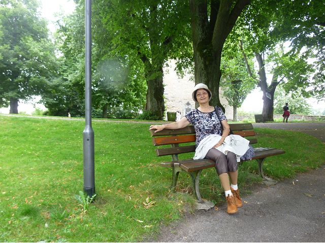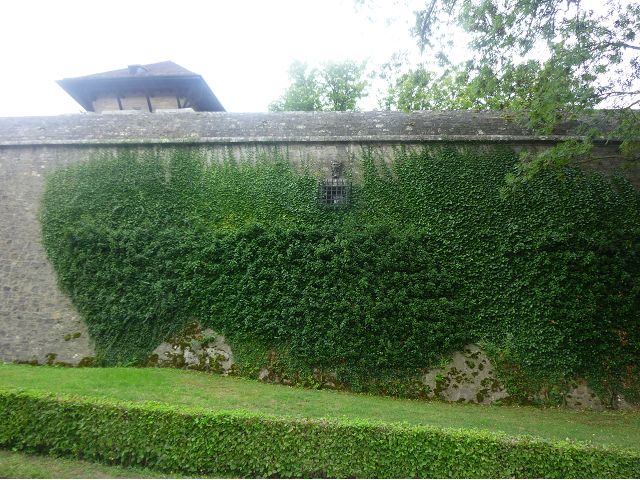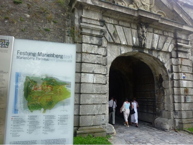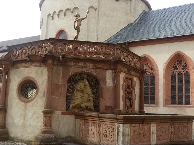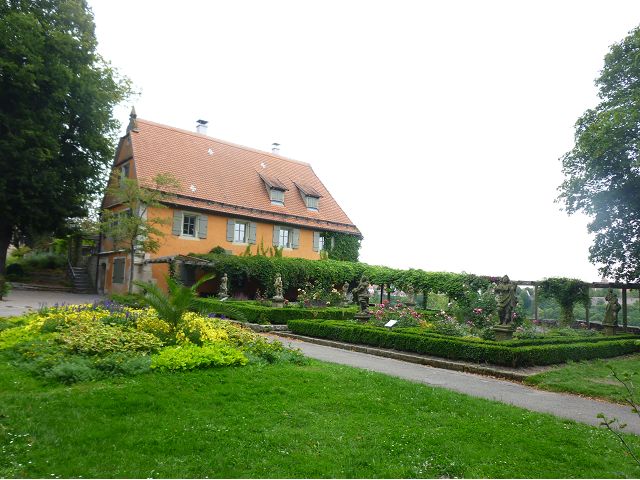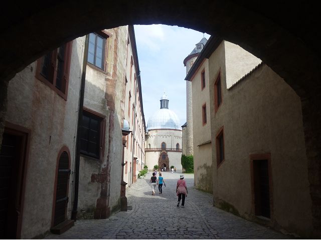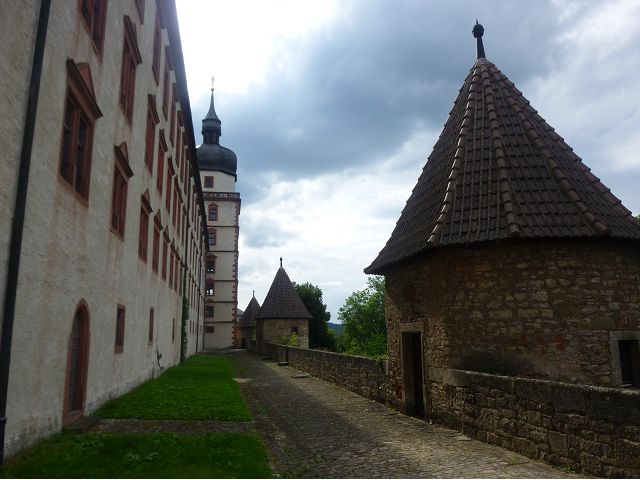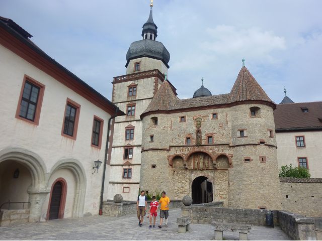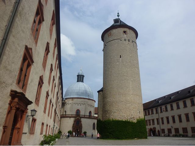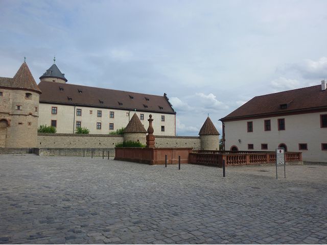接著走過老美茵橋(Alte Mainbrücke),前往河對岸的瑪利亞堡。古老石橋建於1476年,長185公尺,連接老城區與瑪利亞堡,也是該市著名地標之一,僅開放步行,橋上矗立著12尊聖徒雕像,漫步橋上,因有360度視野,可環視眼前的中世紀小鎮、堡壘要塞、高聳的教堂尖塔,也是旅程的樂趣之一。瑪利亞堡位於美茵河上方山丘,自古以來,這座中世紀城堡就是一座要塞,原本是采邑主教將近5個世紀的家,直到1631年被瑞典古斯塔夫二世∙阿道夫征服後,才被改建為巴洛克式堡壘,如今成為一座公園和博物館。參觀時,記不得什麼原因,沒留下室內影像,只留了許多很有特色的圓頂、尖塔、拱門、古色古香的中世紀建築群落、對稱佈置的美麗花圃、居高臨下的街景市容,以及處處牆壁攀藤似翠綠樹枝的情景,正足以彰顯其老而彌新吧。