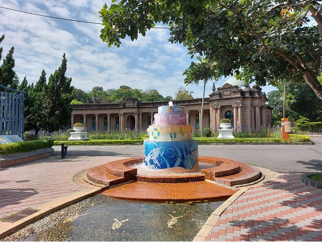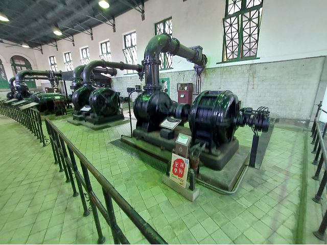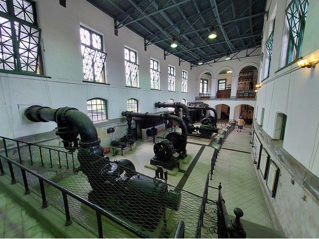 〈台北市現代化自來水設施規劃始於日據初期,明治40年(1907),聘雇英人威廉.巴爾頓來台進行全台衛生工程調查工作。根據其建議,在公館小觀音山山腳下新店溪畔設置取水口,抽水至小觀音山的淨水場,然後用抽水機將淨化後的水抽至山頂的蓄水池,藉由重力流方式供應台北市用水;明治41年(1908)先完成取水口、唧筒室建築與設備裝置,次年輸配水管、淨水場及配水池全面完工,淨水場開始供水,出水量2萬公噸,台北自來水從此邁入現代化供水系統。當時創建的"臺北水道水源地唧筒室"(即今日自來水博物館)就是放置抽水機的機房重地,民國66年(1977),新店溪下游汙染日益嚴重,取水口乃移至上游的青潭堰,唧筒室因完成"抽取原水、輸送淨水"使命而功成身退。自來水博物館主體建築為巴洛克式風格,建築正面成弧形曲線等距排列,平面及立體均左右對稱,半圓形屋頂、山牆勳章飾、圓拱弧形曲線迴廊、愛歐尼克式列柱羊角渦卷裝飾,加上方形窗,以洗石子仿石材粗面處理,整體展現古典優雅風貌,內政部以其有百年歷史,於民國82年6月(1993)列為三級古蹟。〉
