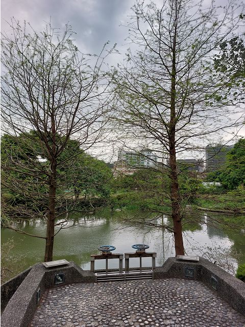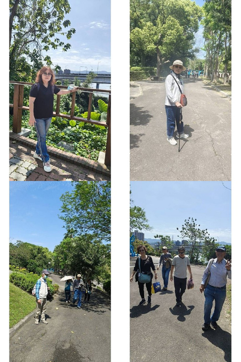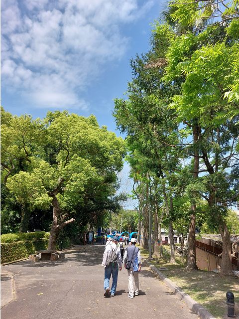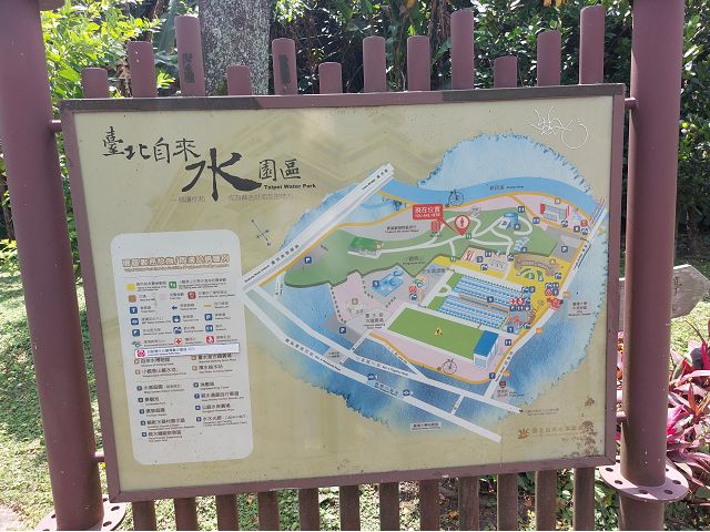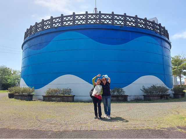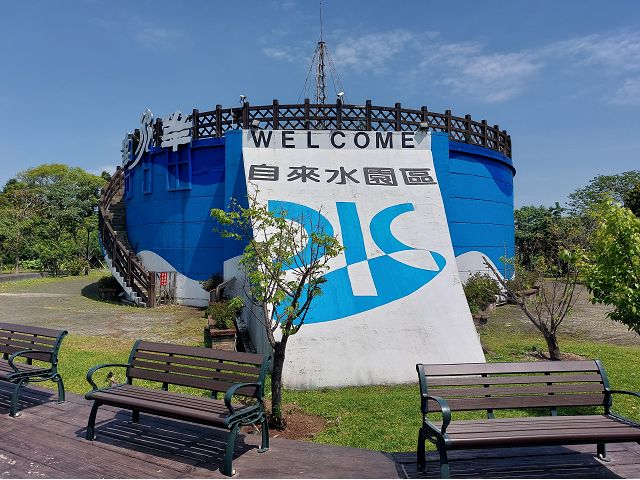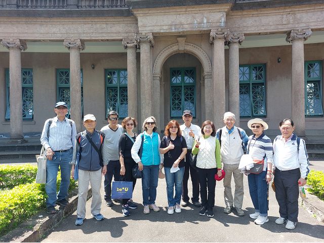 是日,大夥按計畫,於9:30會合捷運公館站1號出口平面層,但嚴兄臨時通知需陪嫂子看診,不克參加走路,會一起用餐。一群資深公民從捷運站走進自來水園區,大太陽底下,迎面見樹蔭下一排木質休憩桌椅,立刻選擇坐下來納涼。此時,女紅說探路時,見館前花圃長出串串藍色花,不知道是什麼花,遂為他們介紹可能是各種顏色的魯冰花並拍照。坐樹蔭下好一陣子,才由主辦人引領,循自來水博物館側邊,緩緩走上小觀音山步道。園區現已轉型為環境教育中心,歐式巴洛克風格建築的博物館為中心,另規劃有水源地苗圃、生態景觀步道、管材雕塑區、輸配水器材區、公館淨水場、水鄉庭園、公館水岸廣場、親水體驗教育區、量水室古蹟廣場等主題區,可我們志在走點路,路過一些主題區也沒多逗留,且走且聊且唱且賞景,沒想到大夥返老還童,居然朗朗上口、吟唱起"走、走...,大家一起手拉手,走、走...,一起去郊遊"、"藍藍的天,白白的雲..... "等老掉牙的歌,而且是唱得興高采烈,一路走到頂端圓形消壓塔處,欣賞下方新店溪、永福橋、水源快速道路美景,然後原路折返,參觀自來水博物館。