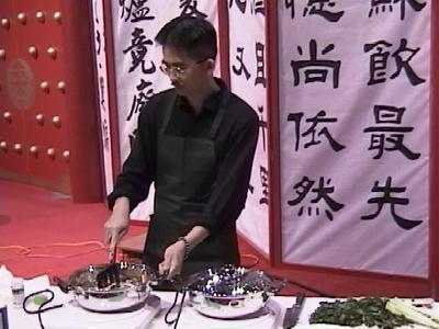 - 將油入鍋, 把蒜頭, 白果, 紅色青椒, 和豆乾絲, 放入炒香, 洒上醬油後, 再加入筍絲和菾菜, 翻動炒熟.