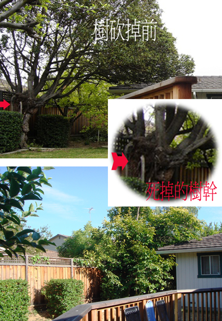 找了二家砍樹公司來比價,一曰八佰;另一曰五佰。花了銀子,40歲大樹就從照片中消失了,有點不忍及有些不捨!隣居太太事後打電話向我道謝將樹砍除。