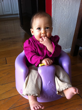 Sabrina在傍晚七點多,吸完母奶後,再和她爹玩十來分鐘,就會吸自己食指及中指,表示是她就寢時間,這一覺睡到天亮。
