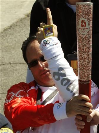 另有一名坐轮椅的男火炬手安德鲁·麦克尔,也在传递圣火过程中,竖起左手食指,向媒体和观众显露出贴在手背上的一幅很小的“雪山狮子旗”,极大地震慑了北京,火炬护卫手(武警)又再露出凶狠本相,对残疾人士拳打脚踢。