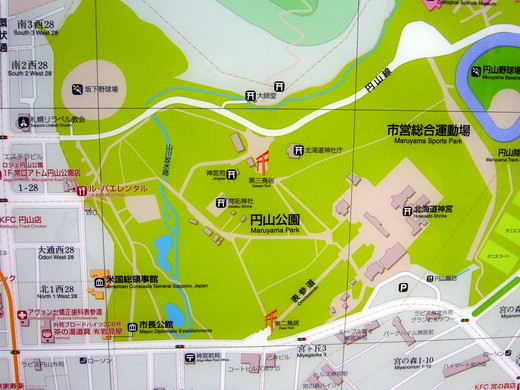 先搭〝南北線〞坐一站到「大通」站,再轉〝東西線〞,今天想就在近郊隨便走走...屁股都還沒坐熱,東西線只搭了三站的距離,「円山公園」到了,這公園面積廣大,園內有球場、競技場(體育場)、動物園,著名的北海道神宮也在其中。