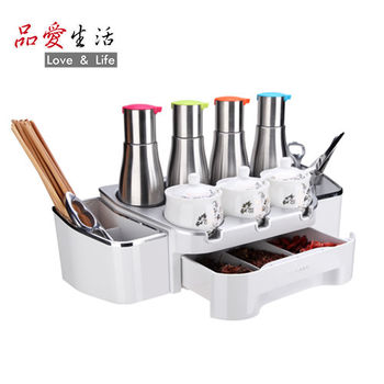 高級ABS材質 拆裝清洗超方便 可瀝水設計 商品名稱 品愛生活 多功能廚房調味置物架商品尺寸 長47 5cmX寬20cmX高26cm商品材質 ABS塑料贈 300ML調味瓶X4 200ML調味罐X3