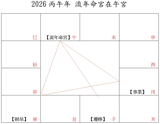 2026丙午年,流年地支「午」,須從命盤的「午」宮來解讀,再配合三方星曜的強弱、吉凶數量的多寡,來判斷每個人的運勢。當然四化的能量更是重要,它是星曜變化的樞鈕,所以請加入生年四化、大運四化,尤其是流年四化。化祿主得財,化權主得勢,化科主得名聲、地位,化忌主困擾、不順。