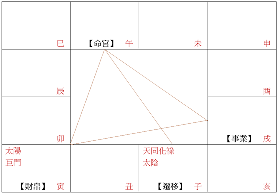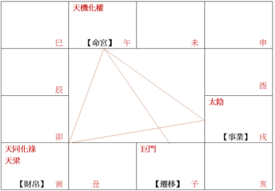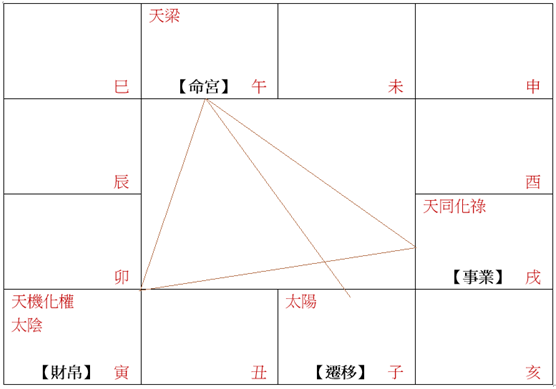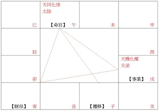 天同化祿在事業宮,事業能有新的發展,並且是良好的發展。財帛宮天機化權、太陰在寅宮,善於錢財的規劃與策劃,使錢財穩定。三方若見文昌化科同時來會,則會萃成「陽梁昌祿格」,最能發揮天梁星的特性,能有所表現。但遷移宮的太陽弱陷,須注意在外人際關係的互動。