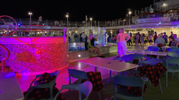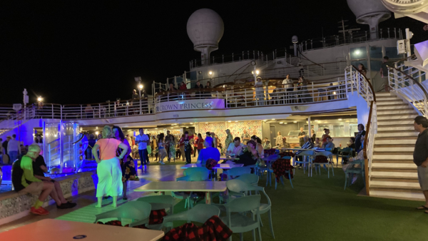 5點,船準時離港,晚上是游泳池畔夏威夷舞會,有些人穿上夏威夷服裝,音樂也是以夏威夷音樂爲主,一直到11點才結束。