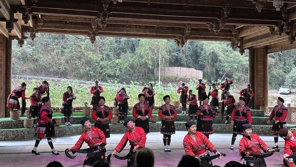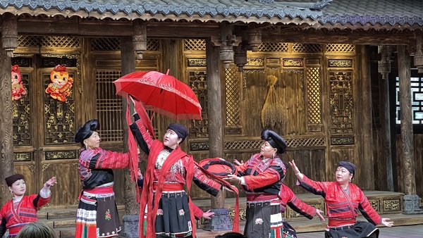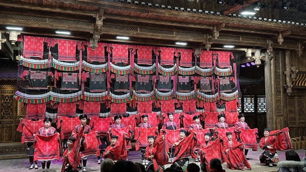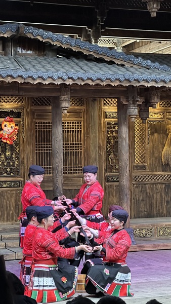 我們買票進去看壯族和瑤寨的歌舞表演。演出其風土文化。如瑤族長髮節、壯族歌圩,結婚喜慶儀式等。有一個節目是表演瑤族女孩如何整理他們的頭髮。傳統上,瑤族女孩一旦結婚,就終生不剪頭髮。一個90 歲的阿婆一頭烏黑的拖地長髮都是用洗米水洗頭洗出來的。吃中飯的餐館也賣用洗米水材料做出來的洗髮精。