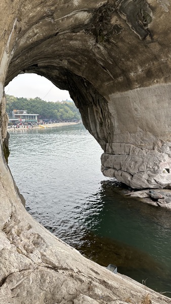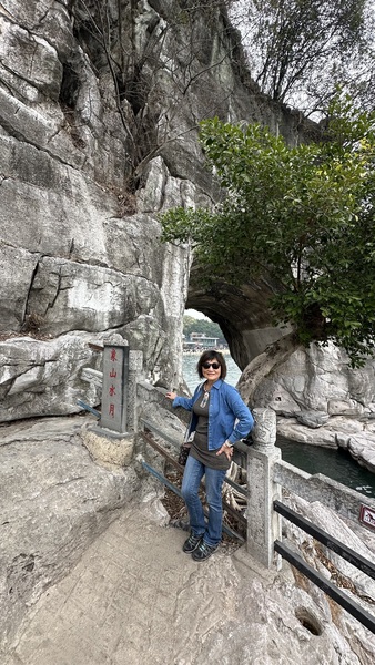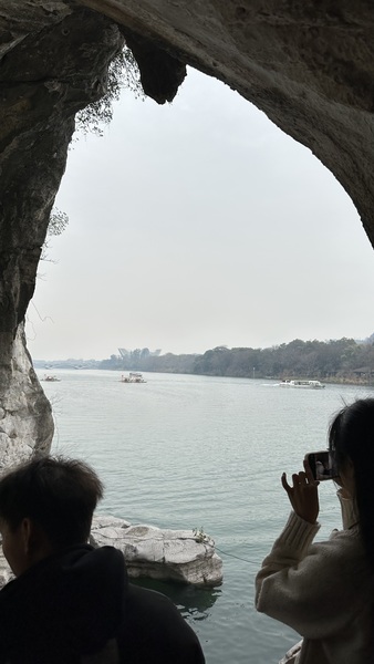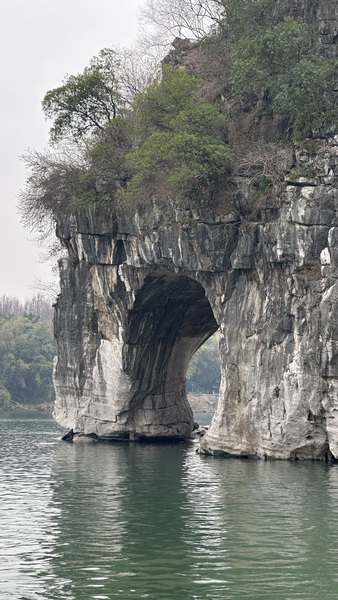 步行至山腳,便見到象鼻山最著名的景點——水月洞。洞穴貫穿山體,洞中江水穿流而過。洞口倒映在水面上,形成一個完美的圓。登高遠眺,山上有一座‘普賢塔’,據說是明代所建。