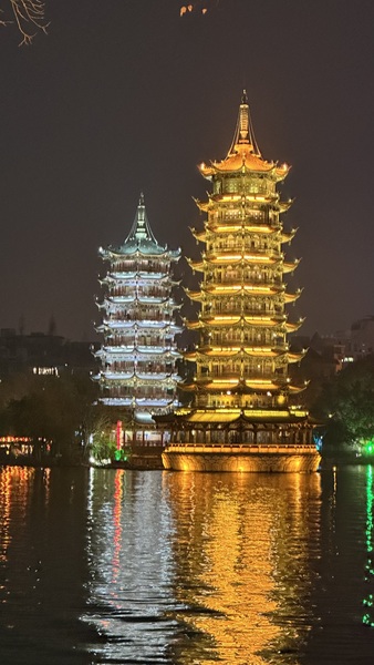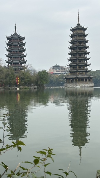 象鼻山附近就是日月雙塔。日月雙塔位於桂林市中心的杉湖湖面上,日塔與月塔分立於湖中。