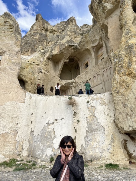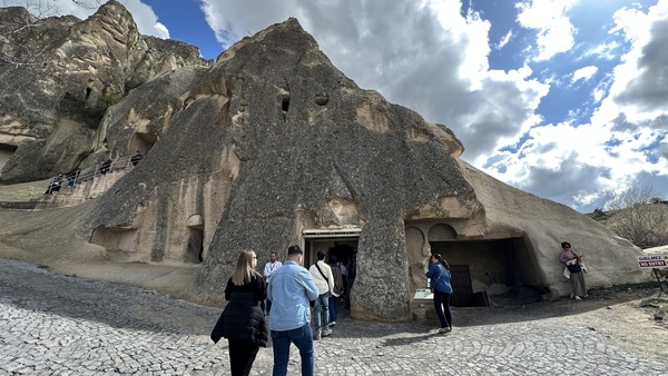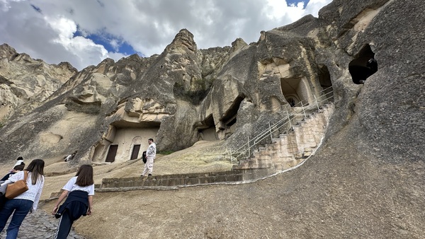 去吉普車越野前,我們參觀了擁有千年歷史的 ‘歌樂美露天博物館( Göreme Open Air Museum)。雖是叫博物館(museum),但其實不是一棟博物館建築,而是一整片雕鑿在火山凝灰岩上的修道院建築群。