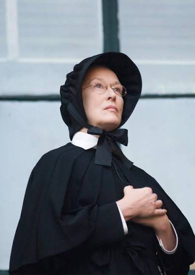艾洛伊修斯修女知道自己必須做‘不那麼聖潔的事’,包括懷疑,質疑,密告,追究,責問,告狀,甚至撒謊。她知道這樣會讓她變得不像一個慈愛的信徒,但她堅持相信自己是在為更高的真理服務。我覺得這也是整部戲的靈魂問題之一,為了正義,我們是否可以犧牲一些屬靈的純潔?追查罪惡會不會讓我們自己變得不像基督徒?