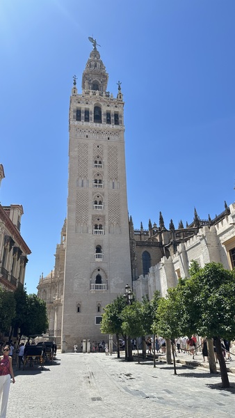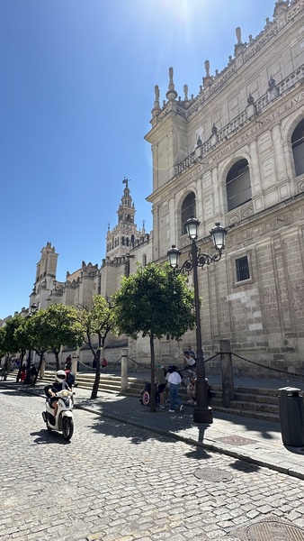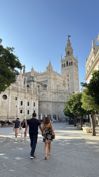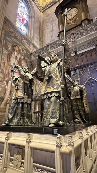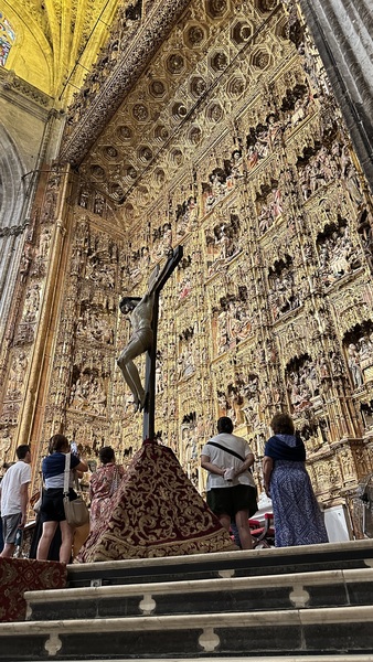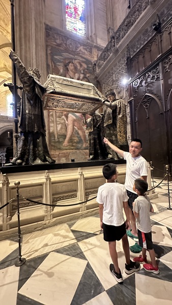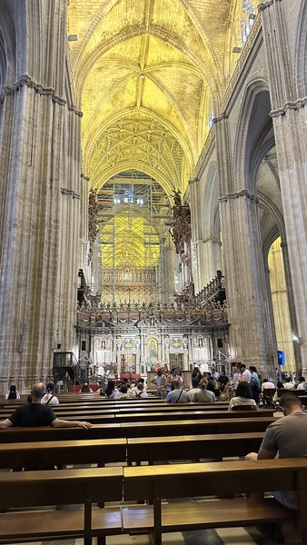 清晨,我們來到塞維利亞大教堂(Catedral de Sevilla & La Giralda),又稱塞維利亞主教座堂,這是世界第三大教堂,僅次於梵蒂岡的聖彼得大教堂和意大利米蘭大教堂。 建於15世紀,融合了哥德式和穆斯林風格,並在原清真寺的基礎上改建而成。 大教堂以其宏偉的規模,精美的雕刻以及大量藝術珍藏聞名,其中最著名的是世界上最大的祭壇屏風和哥倫布的靈柩。