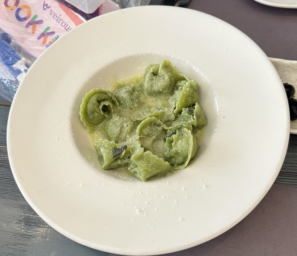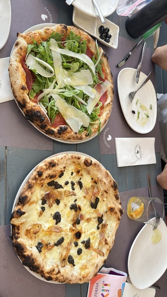 中午,我們專程去網紅 La Paella Sevilla ,這家小餐館以西班牙國民料理「海鮮燉飯」聞名,常常大排長龍。我們只點一份,邊走邊吃,色澤金黃的米飯,吸飽了番紅花與海鮮的香氣,讓人食指大動。 午餐時間,媳婦早早預訂了 La Gallina Bianca。這是一家以披薩聞名的義大利餐館。披薩在木柴窯中烤製,餅皮外脆內軟,帶著煙燻香氣。孩子們吃到披薩都很興奮,我也覺得在西班牙旅程中來一頓義式料理,也頗有異國風味。