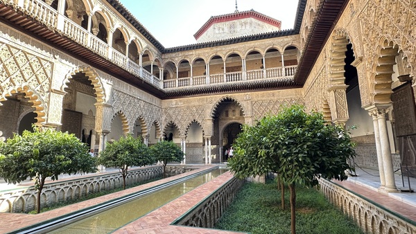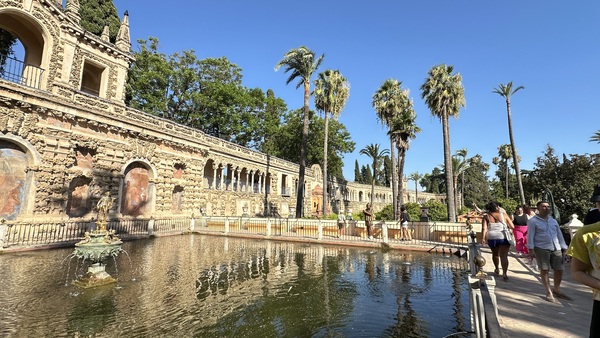 隨後,去皇家阿爾卡薩爾宮(Real Alcázar de Sevilla)。這座宮殿由摩爾人建造,是穆斯林王朝的宮殿,後來被基督教國王接管,歷經多次擴建,如今成為摩爾式(Mudéjar)、哥德式、文藝復興與巴洛克風格完美融合的建築群。