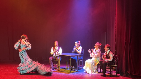 我印象中的弗朗明哥舞是像 “鬥牛的勇士” 舞蹈那般,男士穿著帥氣的白襯衫黑背心,女士穿著大紅的華麗長裙,兩人跳著充滿張力與華麗的舞步。但眼前的舞台上只有幾位歌者,幾位舞者和一名吉他手。有些歌聲帶著哀愁,舞者的腳步強而急促,像跳踢踏舞。手臂的揮動彷彿在對抗無形的壓抑,整體看起來不如想像中熱鬧。