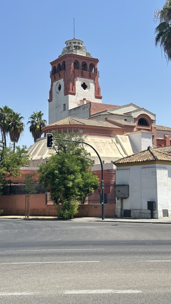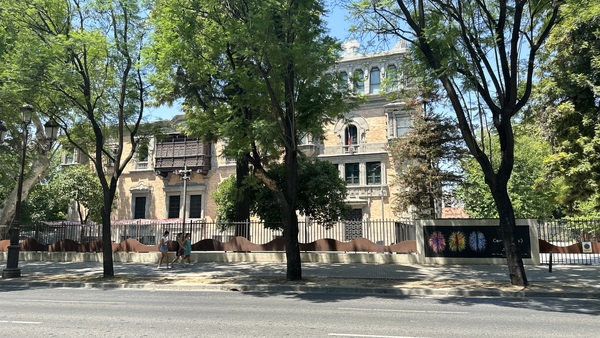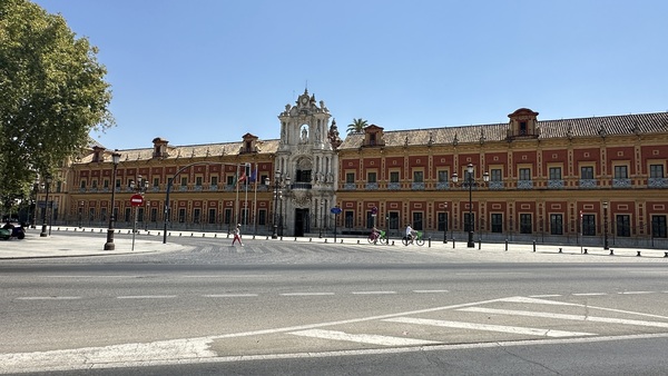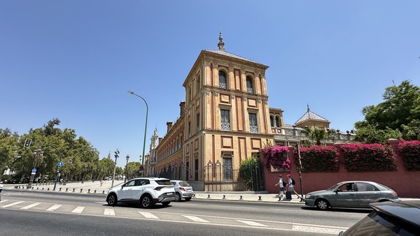 馬車繼續前行,我們看見了紅黃相間的聖特爾莫宮(Palacio de San Telmo)。這座建築最初是航海學校,如今是安達盧西亞政府的總部。正門的巴洛克雕刻繁複華麗,司機特地放慢腳步讓我們欣賞。