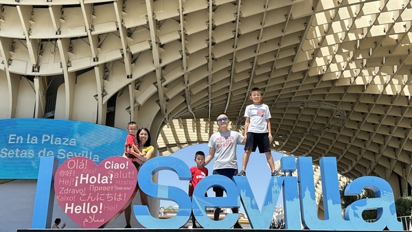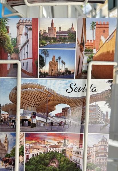從觀景台瞭望,塞維利亞展現在腳下,大教堂的尖塔、舊城蜿蜒的巷弄、紅瓦屋頂一層層延伸到遠方。我們在這裡有塞維利亞字樣的巨型牌前留下合照與笑容。