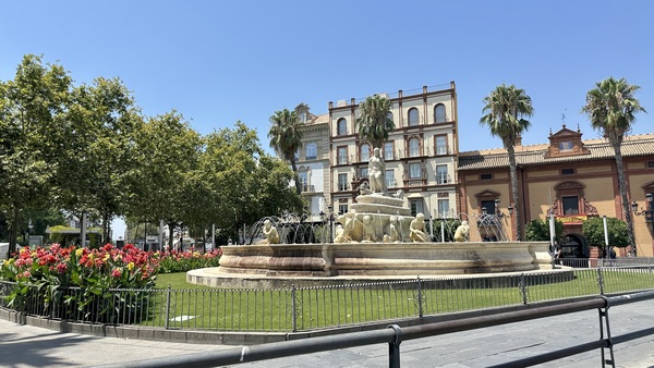 接著穿進 瑪麗亞·路易莎公園(Parque de María Luisa),林蔭大道遮住了烈日,噴泉水花在陽光下閃閃發光,鳥鳴聲和馬蹄聲交錯在一起,讓人感覺時光緩慢了下來。