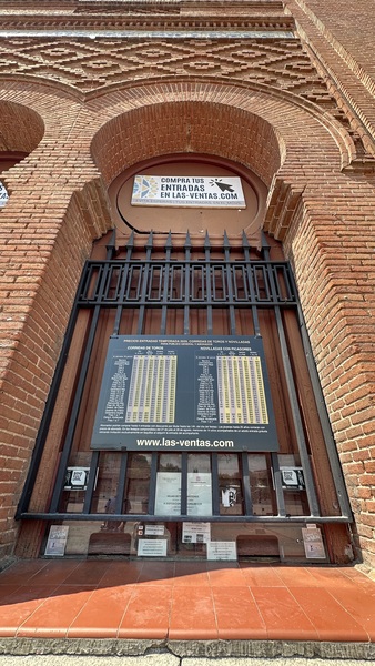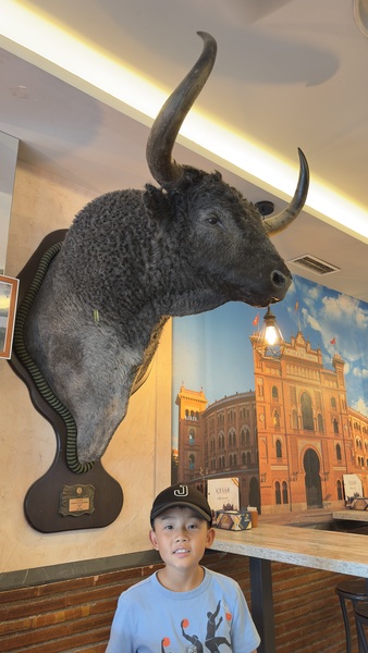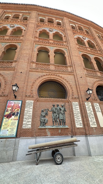 晚上,我們準時又回到拉斯本塔斯鬥牛場(Plaza de Toros de Las Ventas)。紅磚砌成的圓形場館外觀極具特色,內部能容納超過兩萬名觀眾,隨著號角響起,鬥牛士身著華麗服裝,手持紅布,與壯碩的公牛對峙。觀眾席上人聲鼎沸,喝采與驚呼此起彼落。雖然如今鬥牛文化在西班牙已存在爭議,但現場仍能感受到那股獨特的 熱情與殘酷並存 的氛圍。