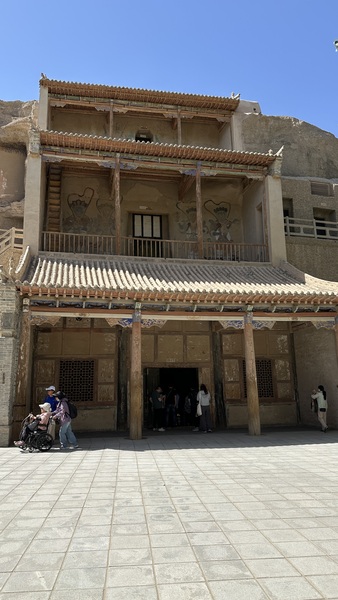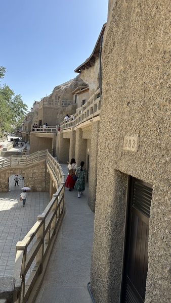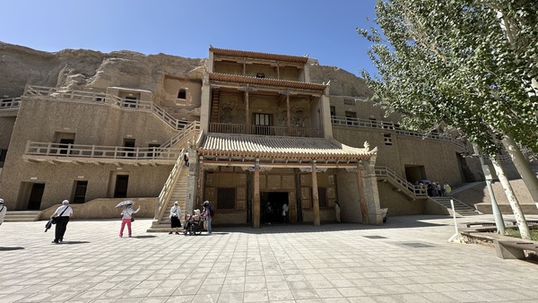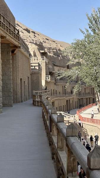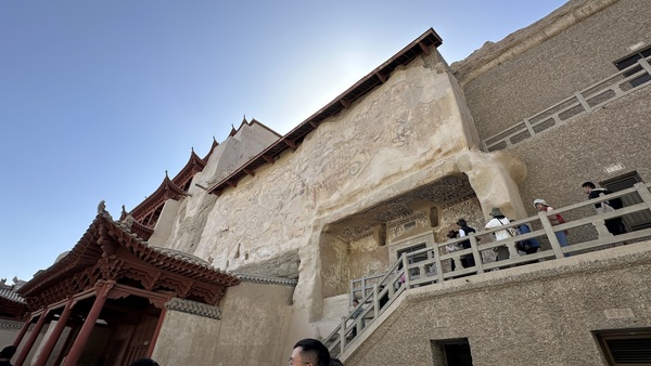 午後,我們來到舉世聞名的莫高窟。高聳的九層佛閣紅牆飛檐,依崖而建,莊嚴肅穆,氣勢恢宏。