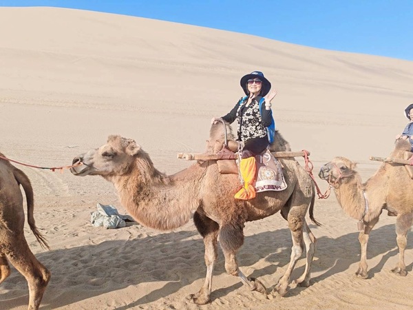 很多遊客都騎駱駝,我們也加入其中。駝隊浩浩蕩蕩,駝鈴聲聲,彷彿再現了古代絲綢之路上商旅往來的繁盛景象。這段約四十分鐘的騎行,不僅讓人感受到沙漠的遼闊,也喚起了對歷史的想像。