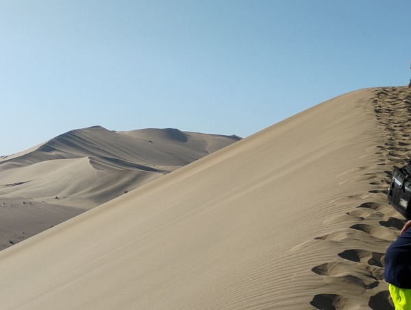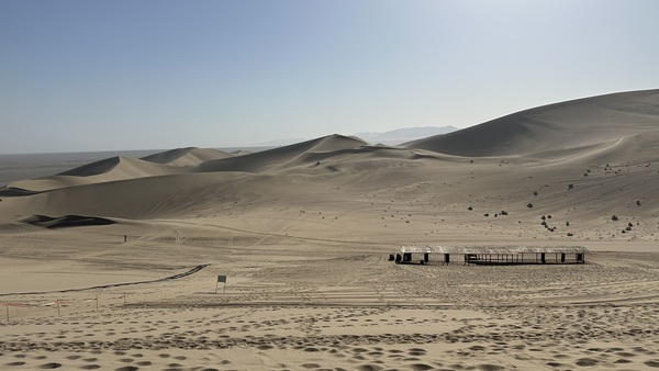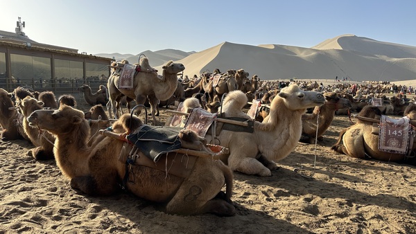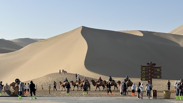一進門,不遠處的金色沙丘在陽光下起伏連綿,宛如大地的波浪,壯麗浩瀚。沙丘上成群的駱駝像古代絲路上的商旅。美國有沙丘,非洲也有沙丘,但這是我第一次見到這麼多遊客同時騎駱駝。