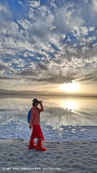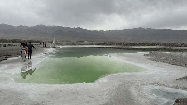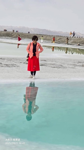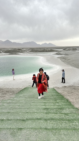 這趟旅程還特別安排了一個小驚喜—團費裡包含一次航拍。導遊早早和我們約定在上午十點半於翡翠湖集合,這是我第一次體驗「個人空拍」。當無人機升空,整片湖泊的翠綠盡收眼底,白色的鹽殼與遠山交織,畫面壯闊。晚上,導遊把錄製好的影片送來,我看著螢幕裡的自己在湖邊行走,身影與湖水相映成趣,那一刻,真覺得「很有Fu」。