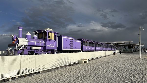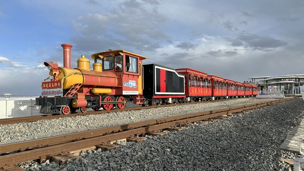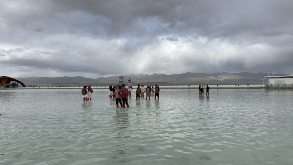 進入湖區,我們搭乘茶卡鹽湖的小火車。小火車有好幾種顏色,每輛都色彩鮮艷,造型別緻,行駛在湖面與鹽田之間,仿佛童話世界的列車。沿途會停靠幾個站點,遊客可以下車遊玩參觀。