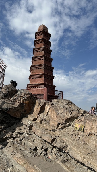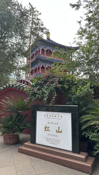 第二天清晨,我們來到 紅山公園。紅山位於烏魯木齊市中心,因山體岩石呈赭紅色而得名,海拔 910 公尺。這座小山不高,但在古代卻是烏魯木齊的重要地標與軍事屏障。清代乾隆年間,為了防禦準噶爾部的入侵,這裡設置了駐防營寨,紅山因此有了軍事要塞的歷史角色。