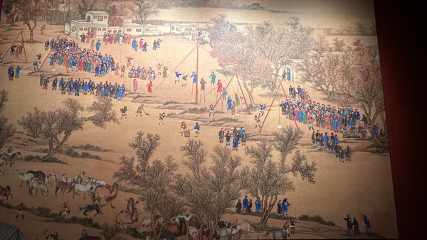 繪畫與民俗部分有《昇平宴景圖冊》中的「回人獻技」,描繪乾隆年間維吾爾族藝人入京表演的盛況,生動展示了文化交流的場景。
