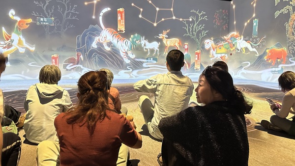 在沉浸式展廳,有大型螢幕播放十二生肖與星座的動畫,聲光效果強烈。他們對其中的「五星出東方利中國」文物特別著墨,將這一考古發現提升為近代中國振興的象徵,我想這應該是宣傳民族主義的一部分吧?!