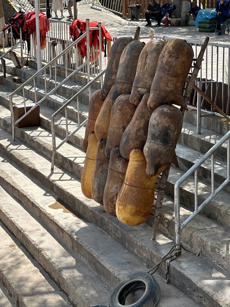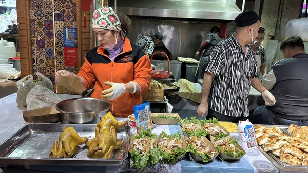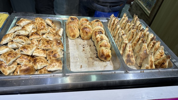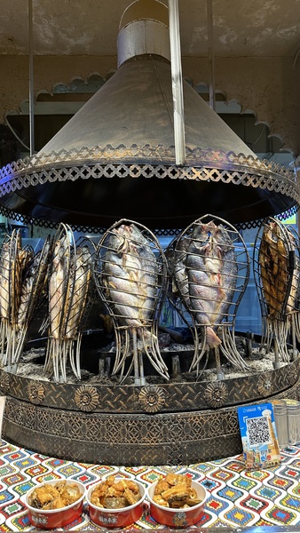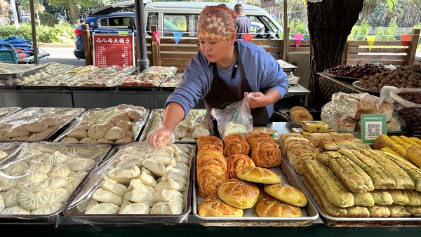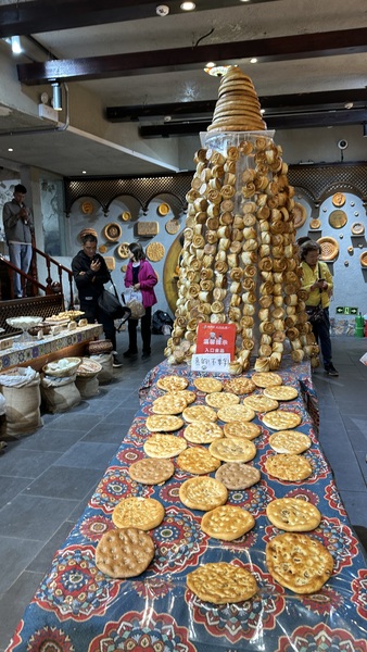 走進大巴紮,立刻被繽紛的攤位與濃厚的香氣吸引。在 ‘囊文化館’,一進門就看到各式各樣的囊餅,有像玫瑰花般的囊塔,也有鋪滿桌面的傳統圓形囊。這些金黃的烤餅象徵新疆人的日常與節慶。