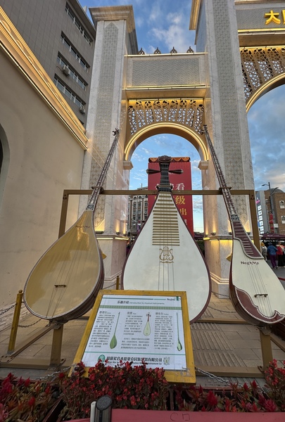 夜幕降臨時,美食街上的燈光閃爍,入口處有大型樂器展示,見到放大的都塔爾、彈布爾、熱瓦甫等維吾爾族傳統樂器。