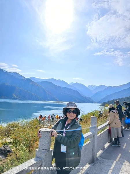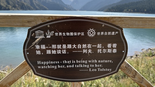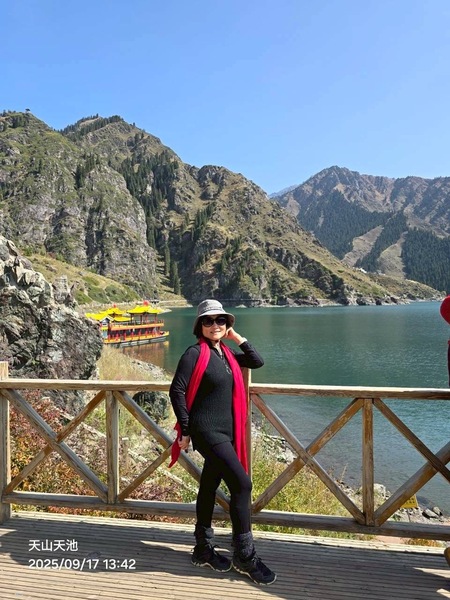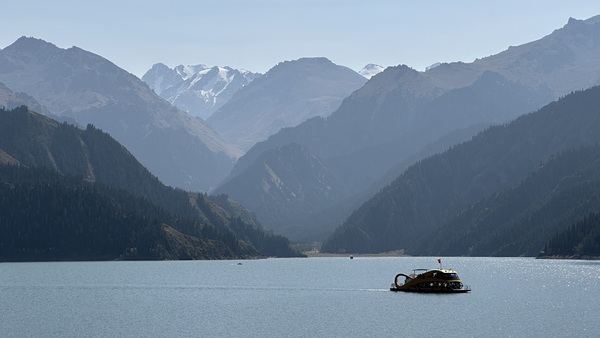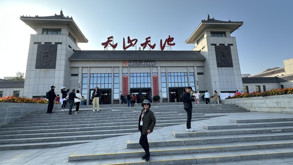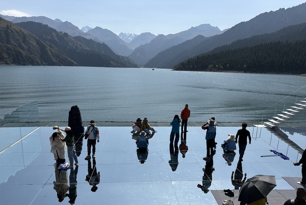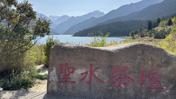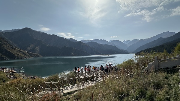 在觀景平台上眺望,博格達雪峰潔白矗立,湖面閃爍粼粼波光,遊客倒映在玻璃棧道上,宛如幻境。岩壁上還能見到題刻文字,為這片古老的聖湖平添一份人文氣息。難怪清代紀曉嵐詩句讚歎:「天山雪影大如席,瑤池月色清於水。」