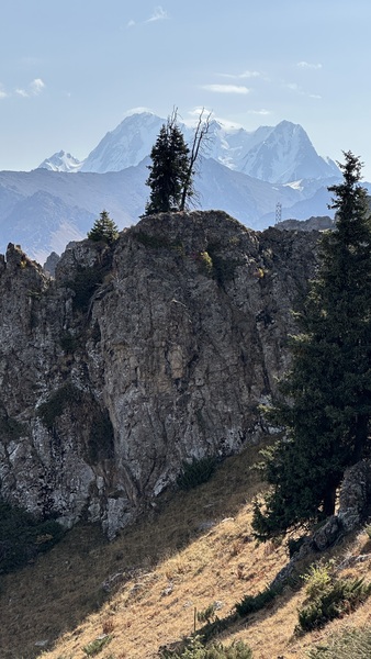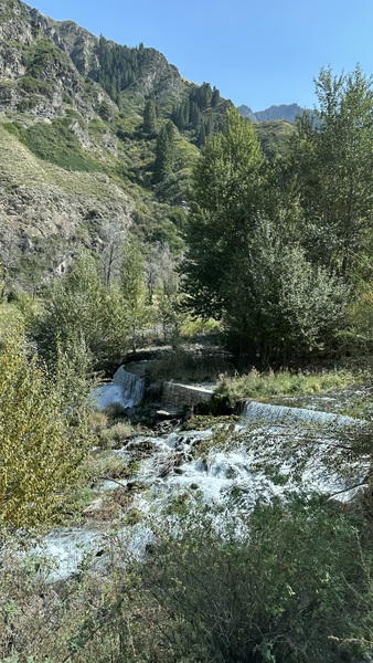 遊覽車行駛 1.5 小時抵達天山景區,再換乘景區巴士一路盤旋而上。沿途松林層層疊疊,偶爾有溪水從山谷間奔流而下,白色水花在陽光下閃耀。窗外時而是高聳的冷杉林,時而是裸露的灰色山岩,視野隨著車輛爬升逐漸開闊,空氣也愈加清新。