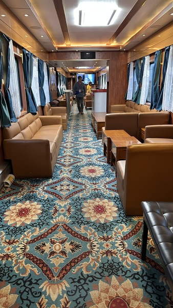 這是團裡大多數人第一次真正「坐火車遊新疆」,一上車安頓好行李,大家興奮地走遍各個車廂探險。火車設施頗具特色:有卡拉OK包廂、麻將間,讓夜行途中不再單調;也有餐廳車廂,可以邊用餐邊看戈壁夜景。甚至還設有小隔間按摩椅,讓旅客舒緩疲勞。
