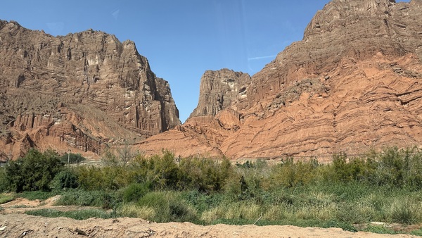 休息片刻,一路繼續往庫車方向前行,經過湖泊,司機師傅會停下讓我們拍照。不久,地貌開始轉變。蒼翠消失,取而代之的是赤紅的岩壁與黃土的荒涼。這正是獨庫公路迷人之處,一天之內穿越四季,數百公里之內體驗四種地貌。