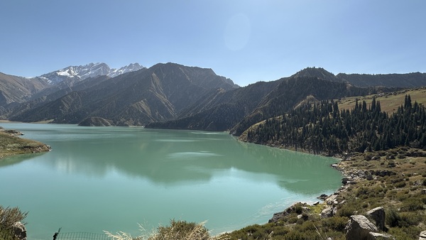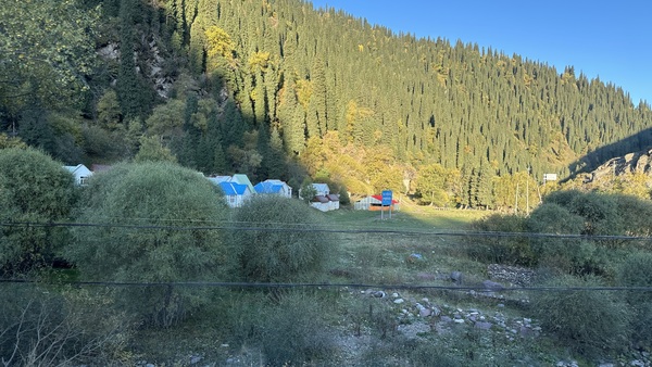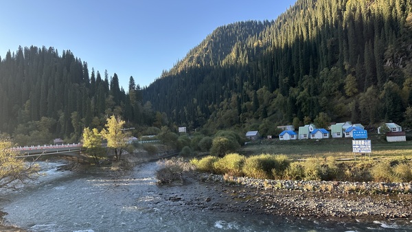 從那拉提離開,車子逐漸駛入獨庫公路的中段。山谷兩側的石壁筆直聳立,河水在腳下奔騰,綠色林木依著河岸一路蔓延。時不時可以看到牧民的帳篷,牛羊沿著山坡緩緩移動,點綴在山色之中。