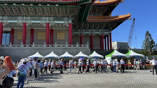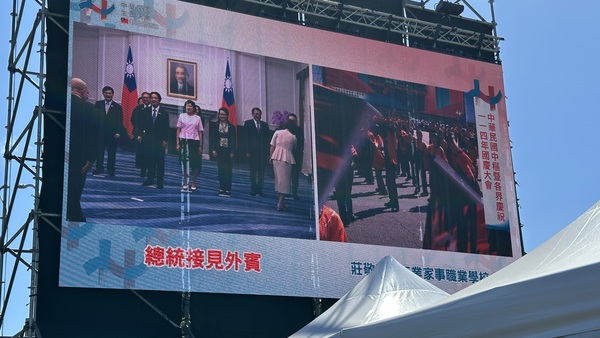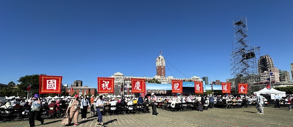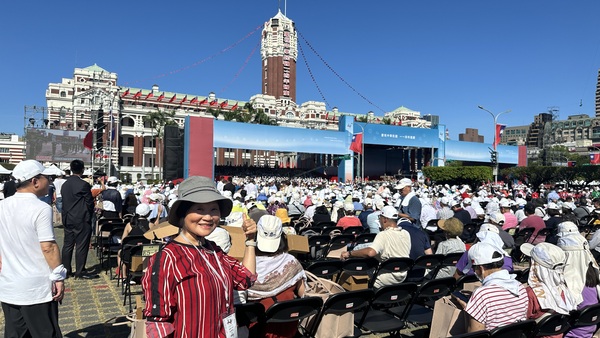 走到 ’全球華僑慶祝國慶’ 幾個大字的座位區,天氣好熱,很難找得到陰涼地方。現場陽光炙熱,很多人頭上都戴著僑委會送的有台灣字樣的帽子,滿懷熱情地參與國慶大會。