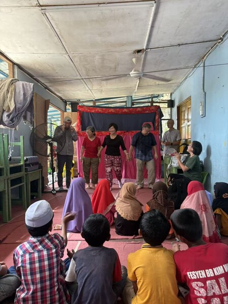 上午前往附近一所由這次機構設立的難民學習中心。這裡的老師原本也都是難民,如今他們已經能夠反過來教導其他難民孩子,令人感動。中心目前共有八十多位不同年齡層的學生。我們為其中十八位七到九歲的孩子表演了木偶戲。孩子們在唱歌、跳舞之後,在他們上課的客廳席地而坐,滿懷興奮地觀看他們人生中的第一次木偶戲。整場三幕、約十五分鐘的表演中,孩子們不時發出歡笑與掌聲,他們明亮的眼神與純真的笑容讓我們深受激勵。隨後的摺紙、畫畫等遊戲活動也讓他們樂在其中,投入專注。
