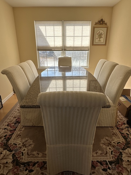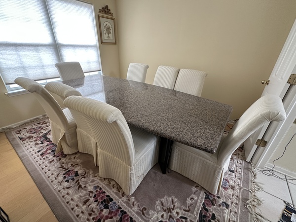 花崗岩餐桌,長108吋,寬48吋,厚重、沉穩,是很多年前特別訂製的。為了跟butlers pantry 的counter 匹配 ,花了很多時間選石材,顏色、紋路。每個邊角的處理都反覆確認。整個是一塊大花崗岩切鑿出來的。