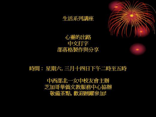 寧簡介部落格的由來﹐安危及推薦數個普受歡迎的網站, 並鼓吹大家上校友會的部落格玩﹐希望以後芝城的社團能連結在一起﹐互通有無﹐以此當作交通平臺﹐辦起活動應該更有效率。