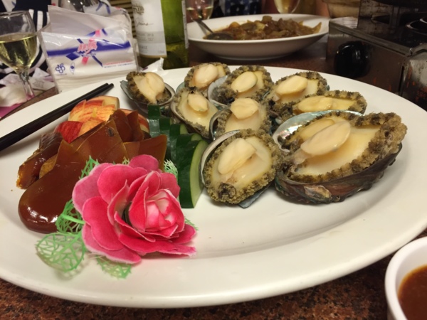 尤其是到了彰化,方立掏腰包請客的滿漢全席海鮮大餐,讓大家都傻了眼,幾乎所有臺灣最名貴的海鮮都上場,鮑魚,魚翅,海篸,螃蟹,大蝦,乾貝,烏魚子,生魚片,鼠魚,蚵仔。。。。。。。還有許多我叫不出名字的海產,每一道都是真材實料,分量十足,像烏魚子,每片都是平常餐館的十幾倍厚,令人嘖嘖稱奇,飯後的甜點蔴薯,真是美味,有些人喫不下帶回去,第二天分給同學吃,細細品嘗,比在餐館更好吃,可能因爲在餐館實在喫太飽了。