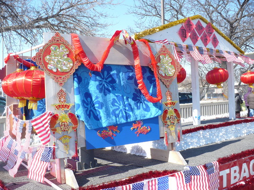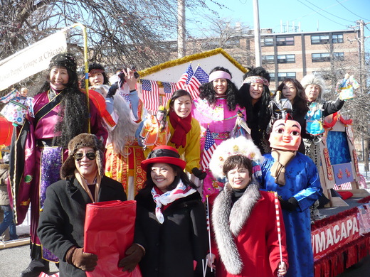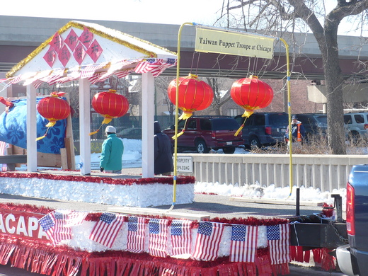 大年初一, 芝加哥的中國城有新年花車遊行, 這是此地華人的大結合,兩岸各派出數輛花車, 再加上華商會等等共十七輛花車. 說好無關政治, 只准掛美國國旗, 不准掛五星旗及青天白日旗, 一切是為了向美國社會展示中國的過年氣氛,一方面介紹中國最大的新年傳統節慶, 一方面也有助於中國城的形象及生意.