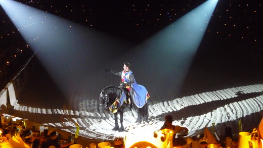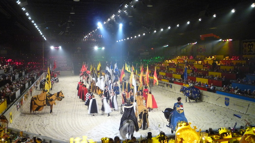 這是一個長橢圓形的場地,場地中間鋪滿沙子,四周看台按顏色分為若干區,表演開始,晚餐也開始。除了晚餐, 還有兩小時的馬術'格鬥表演. 進去的觀眾分幫派,給自己的騎士加油,輕甲騎士在馬上衝刺,在地上決鬥,交鋒的雙劍擦出一連串的火光。振奮的音效,飛揚的馬蹄,國王和王后以及忠實的騎士, 長矛劍盾打起來噹噹作響, 劍拔弩張,煞有其事.