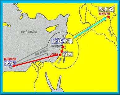 約拿﹕ 不管那麼多﹐ 我要走了﹐我絕對不去尼尼微, 我嶄時先去他施一陣子﹗希望過些時候﹐ 耶和華就忘了這回事了。