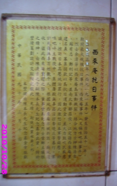 西來庵為單進殿一偏殿的建構,主祀五福大帝,偏殿為中軍府,由於是新建廟宇,相關古文物並不多,倒是有個角落專門祭祀西來庵事件的抗日烈士們,想了解西來庵事件始末的人,不妨來此找尋相關資料。