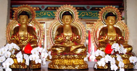 一般大型的正統寺院,其大雄寶殿的佛像擺設,都會以「橫三世佛」為主體,也就是我們常說的「三寶佛」。